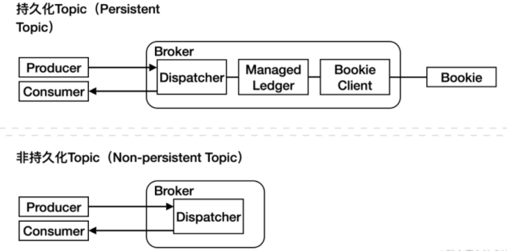 生產者和消費者是同 Broker 中的 Dispatcher 模塊交互的,而持久化 Topic 中生產者數據會通過 Dispatcher 進入 Managed Ledger 模塊,再調用 Bookie 客戶端與 Bookie 交互。非持久化 Topic 中數據不會進入 Managed Ledger,而是直接發送給消費者。在大流量場景中,非持久化 Topic 由于不需要與 Bookie 交互,對集群的帶寬壓力會明顯降低。