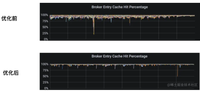 void doCacheEviction(long maxTimestamp){ if (entryCache.getSize() <= 0) {return; } if (factory.getConfig().isRemoveReadEntriesInCache()){PositionImpl evictionPos;if (config.isCacheEvictionByMarkDeletedPosition()){ PositionImplearlierMarkDeletedPosition=getEarlierMarkDeletedPositionForActiveCursors(); evictionPos = earlierMarkDeletedPosition != null? earlierMarkDeletedPosition.getNext() : null;} else { // Always remove all entries already read by active cursors evictionPos=getEarlierReadPositionForActiveCursors();}if (evictionPos != null) { entryCache.invalidateEntries(evictionPos);} } //Remove entries older than the cutoff threshold entryCache.invalidateEntriesBeforeTimestamp(maxTimestamp);}這里簡單地將一定時間內的數據緩存到 Broker 中,有效提升了場景中的緩存效率: