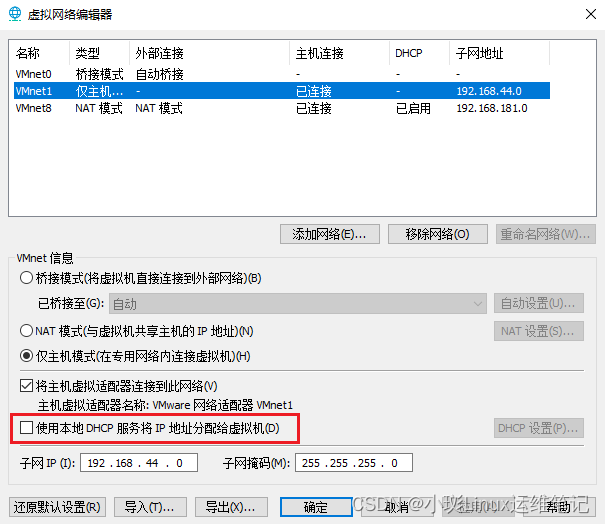在點擊虛擬機左上角編輯>虛擬網絡編輯器>Vmnet1>取消使用DHCP服務器分配IP