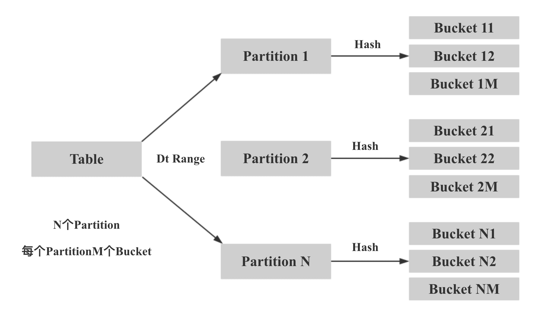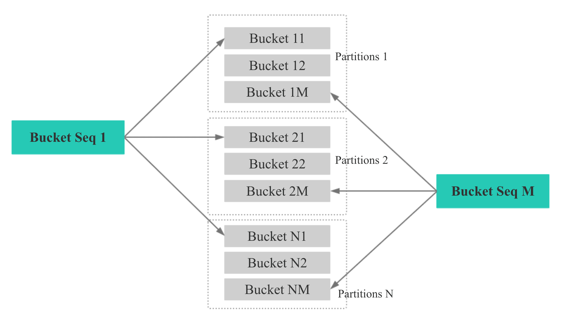 如下圖,如果一個表有 N 個 Partition, 則每個 Partition 的第 M 個 bucket 的 Bucket Seq 是 M。