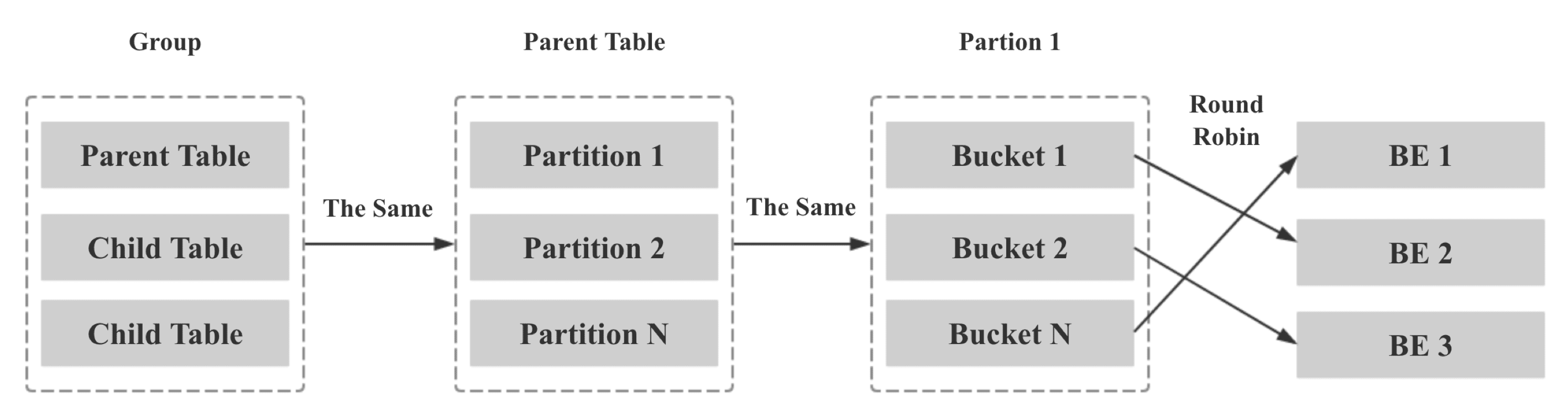 - Parent Table 第一個 Partition 的 Bucket Seq 和 BE 節(jié)點的映射關(guān)系利用原生的 Round Robin 算法決定