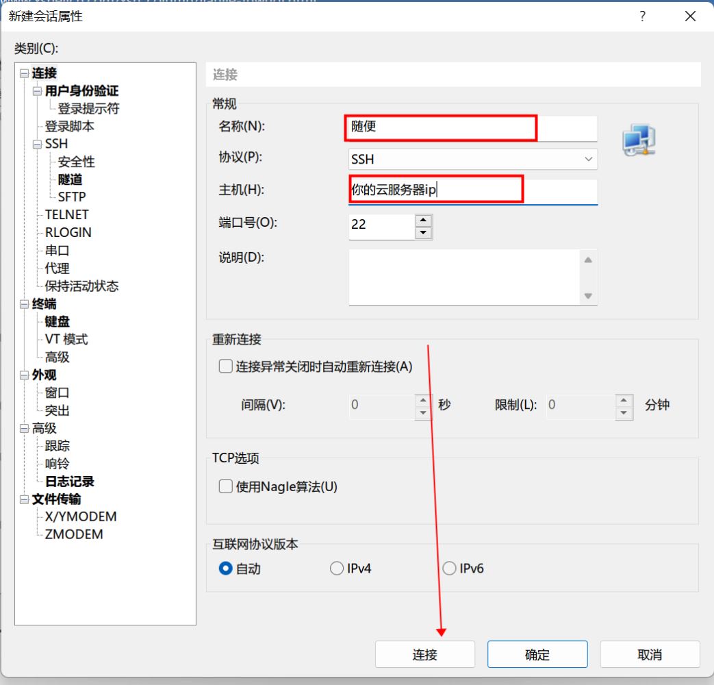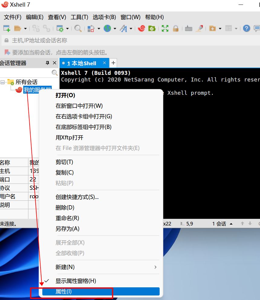 3、這時界面左側的會話管理器中會多出一個剛設置完成的連接會話,右鍵單擊這個會話,點擊屬性,進入會話屬性窗口。