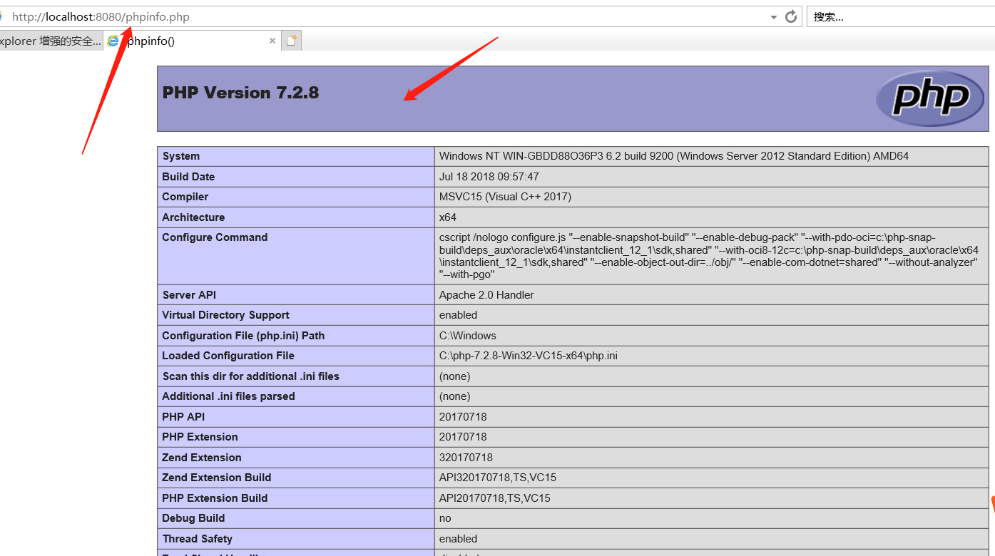 打開瀏覽器,訪問http://localhost:8080/phpinfo.php,出現(xiàn)PHP配置界面