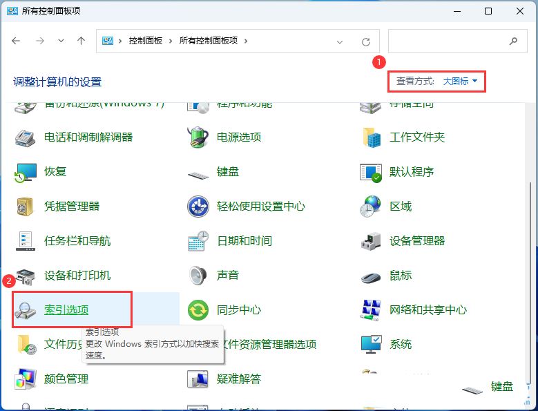 3、所有控制面板項窗口,切換到【大圖標】查看方式,調整計算機的設置下,找到并點擊【索引選項】;