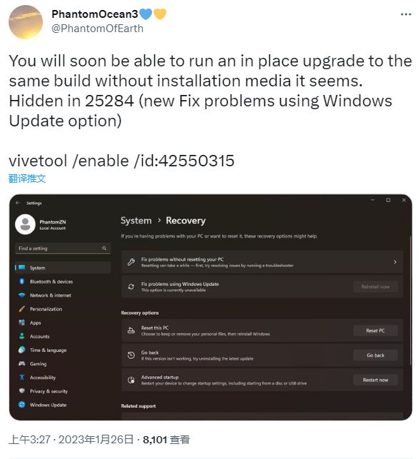 這是一項(xiàng)被稱為“使用 Windows Update 更新修復(fù)問題”或“修復(fù)升級 / 修復(fù)安裝”的新功能,目前可借助 vivetool /enable /id:42550315 開啟。