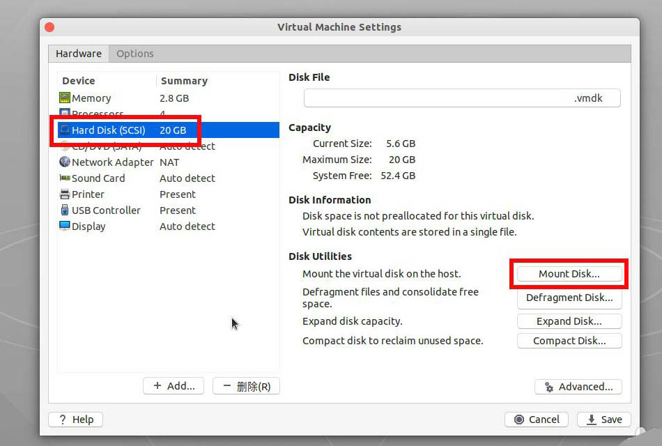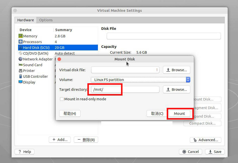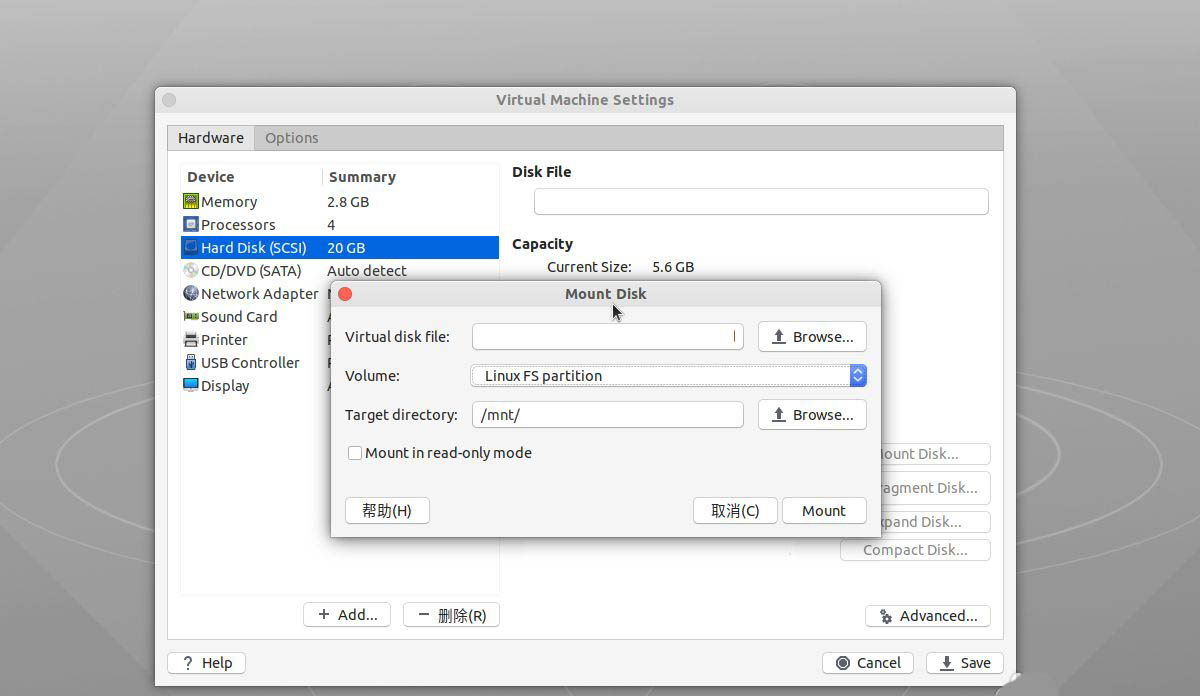 在左邊的選擇我們的 Hard Disk 虛擬硬盤 選項,右邊選擇 Mount Disk...掛載磁盤。