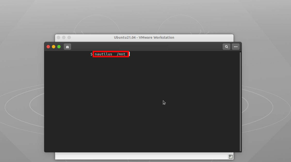 接著我們ctrl+alt+t打開終端,在里面使用nautilus mnt命令打開我們的mnt文件夾。