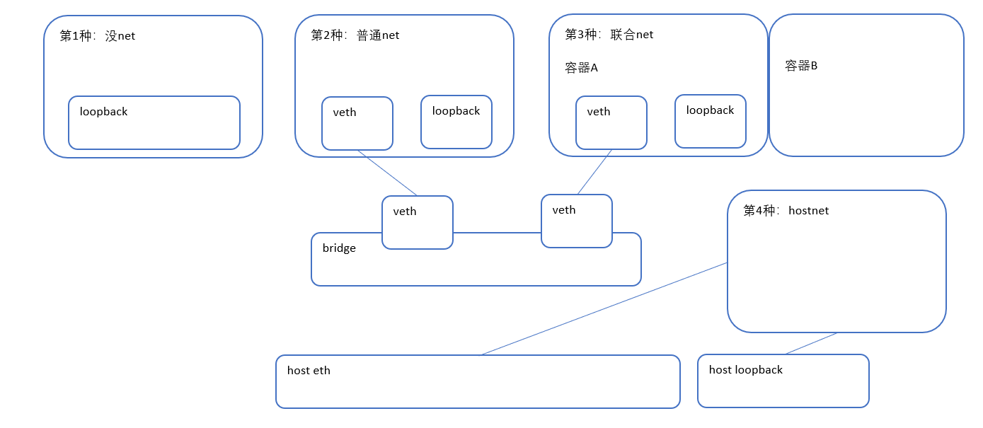 docker還有其他幾種模型,比如沒net,容器中只有環回網絡loopback。聯合net,多個容器使用相同的veth。hostnet,容器直接使用宿主機網絡。