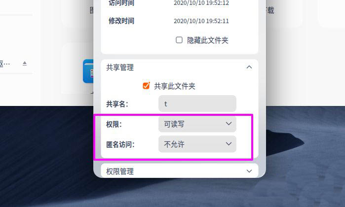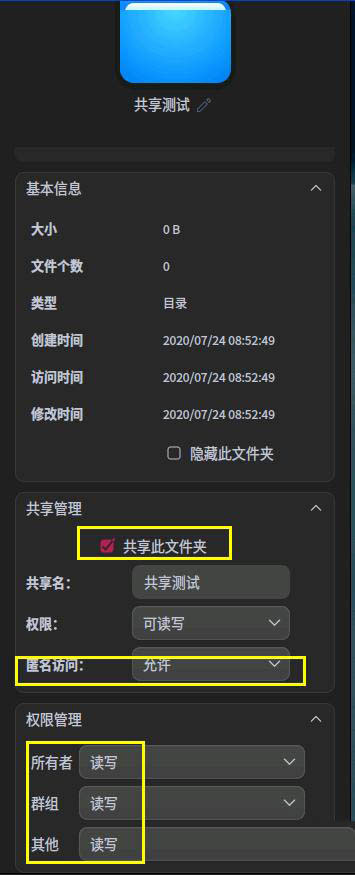 勾選【共享文件夾】后,下方的權限和匿名選項即可進入可設置狀態(tài)。
