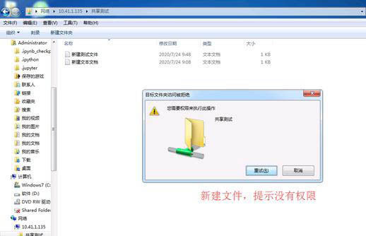 7、再在windows中打開共享文件夾,新建文件,提示無權限,無法新建