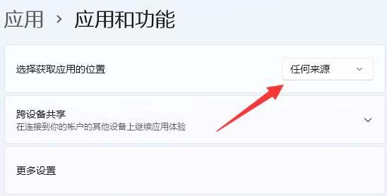 5、最后將選擇獲取應用的位置改為“任何來源”即可解決。