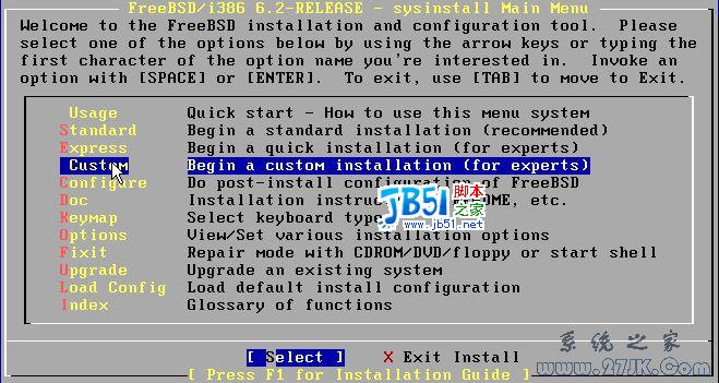 我們要最小化安裝FreeBSD系統(tǒng),這里我們選擇自定義【Custom】