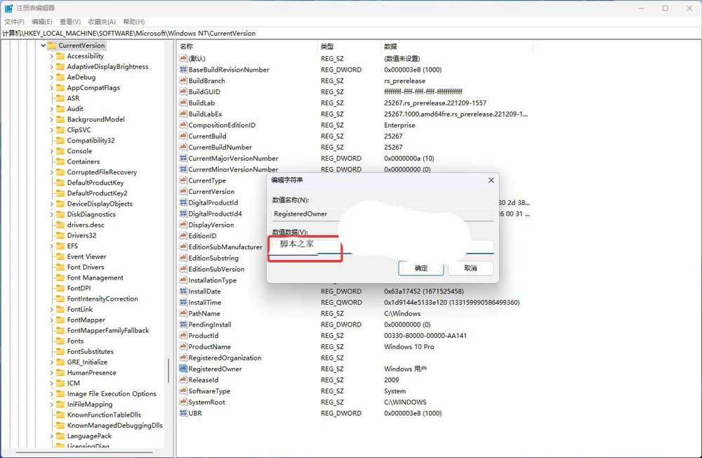 4. 雙擊 RegisteredOwner,修改為你想要的設備用戶名稱,例如這里小編修改為“”