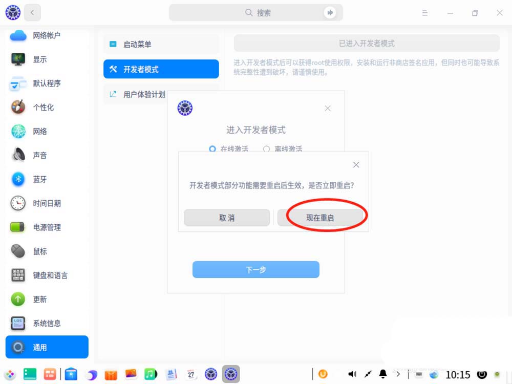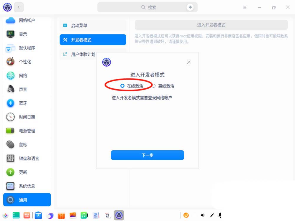 對于已經(jīng)聯(lián)網(wǎng)的設備可以直接轉到UOS系統(tǒng)的控制中心(即設置)、通用、開發(fā)者模式、在線激活即可開啟該模式。