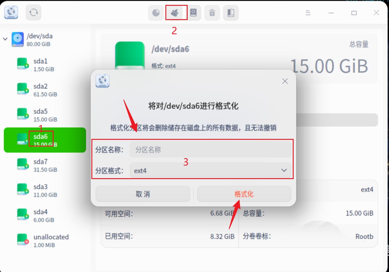 首先,左側選中要格式的磁盤分區,之后單擊上方的格式化按鈕,之后輸入分區名稱以及分區格式(默認為ext4分區格式),最后點【格式化】,全部過程如下圖所示。
