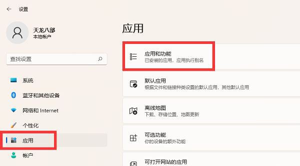 2、接著進入左邊“應用”,并打開其中的“應用和功能”。