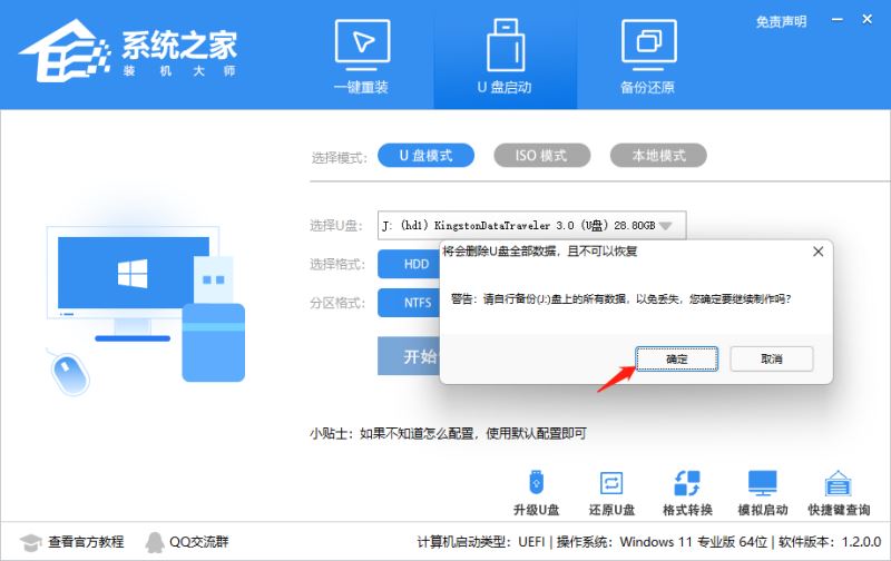 工具會自動提示是否開始制作。注意:制作工具將會清理U盤中所有的數據且不可恢復,請提前存儲U盤中重要數據文件。