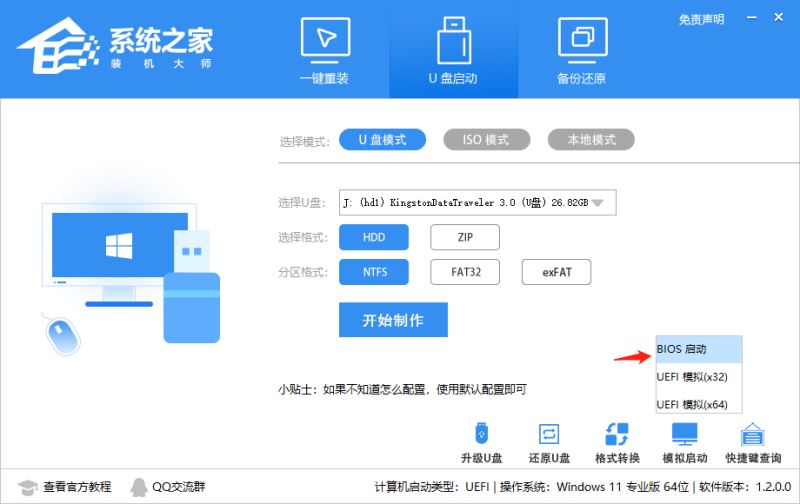 進入工具后,在最上方選擇U盤啟動,保留默認的格式,點擊開始制作。