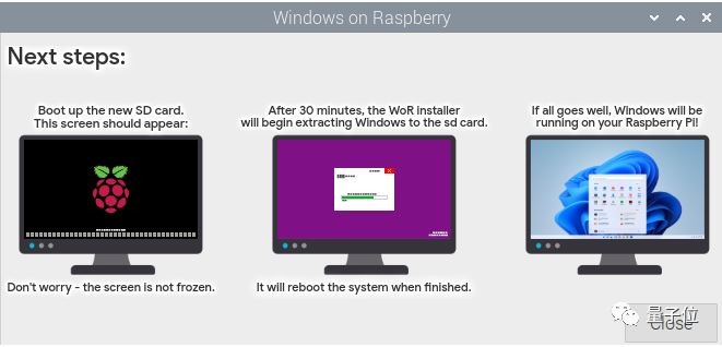好了,最后一步,終端運行完成后、圖形界面繼續彈出按照提示把燒好的內存卡插上樹莓派,腳本會繼續自動幫你安裝好 Windows 系統并重啟 —— 一切就搞定了(安裝大概需要 30 分鐘)。