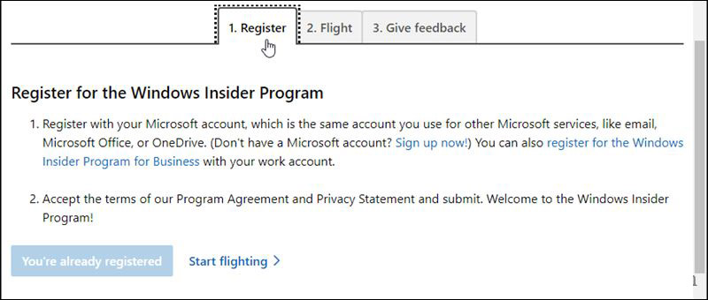 如果您尚未注冊 Windows 預覽體驗計劃,請轉至https://insider.windows.com/en-us/register并單擊立即登錄。