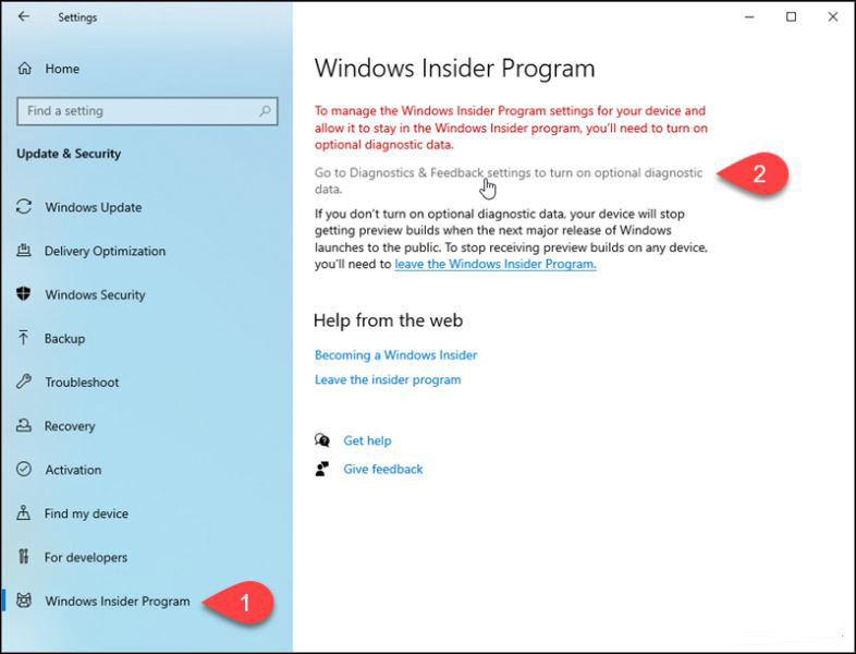 轉到Windows 預覽體驗計劃屏幕,然后單擊轉到診斷和反饋設置以打開選項診斷數據。