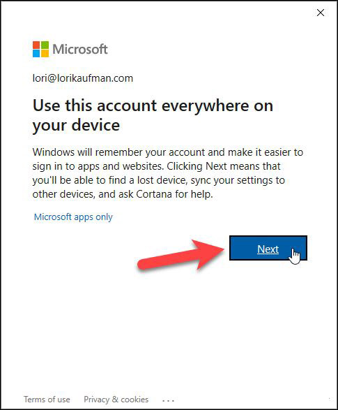 輸入用于注冊 Windows Insider Builds 的同一 Microsoft帳戶的電子郵件。然后,單擊“下一步”。