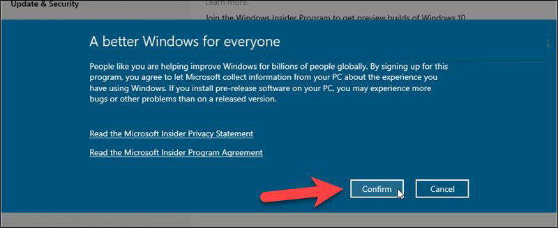 在Pick your Insider settings彈出對話框中,選擇Release Preview Channel并單擊Confirm。