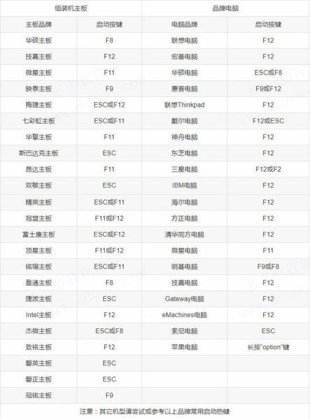 以下為各種品牌的主板和筆記本的快捷啟動按鍵: