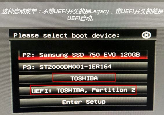 2、找到要啟動的U盤,并辨別UEFI和Legeacy方式;