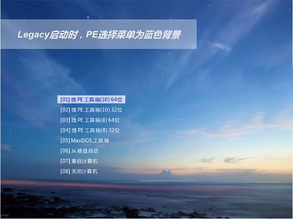 3、選中需要啟動的U盤選項,繼續(xù)敲回車之后,均會先進入PE版本選擇界面。但以不同的方式進入,顯示的PE選擇界面是不同的。Legacy啟動時,PE選擇菜單為藍色天空背景。UEFI啟動時,PE選擇菜單為黑色純色背景。