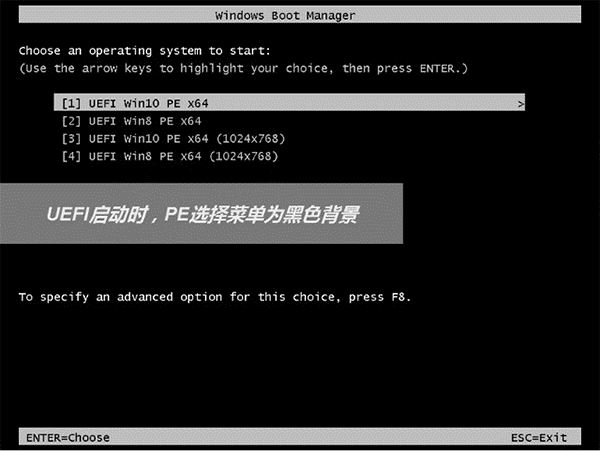 2、UEFI/Legacy啟動方式的選擇,對后續(xù)安裝系統(tǒng)的時候影響比較大,一般情況下,如果需要用EFI方法安裝系統(tǒng)(硬盤分區(qū)表為GPT),就啟動UEFI的PE。如果用傳統(tǒng)方式安裝系統(tǒng)(硬盤分區(qū)表為MBR),就Legacy啟動方式啟動PE,這個按照您自己的需求選擇。如果不清楚的話可隨意先進一個,如果后面遇到問題再回來重選即可。如果是只支持Legacy啟動的老機器,那就沒得選,只能以