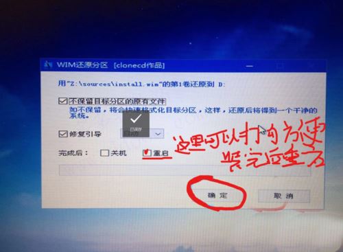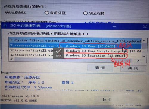 10、返回到桌面打開CGI備份還原,選中C盤,然后在下面選擇瀏覽鏡像,在U盤里面找到系統(tǒng),例如途圖中我選擇的是Win10 家庭版,選擇好版本后點擊確定,建議大家把完成后重啟打勾,裝完后直接就會進入新的系統(tǒng)了,就相當于你剛買的新電腦開機那樣的界面