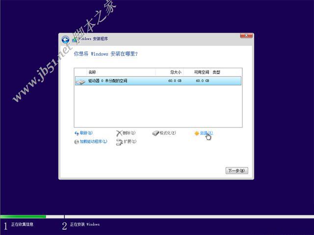 8、進入到分區(qū)界面,如果之前有系統(tǒng),要先備份好數(shù)據(jù),格式化系統(tǒng)所在的分區(qū),執(zhí)行第12步,如果要重新分區(qū),要先刪除所有分區(qū),只剩下一個未分配的空間,選擇未分配的空間,點擊【新建】;