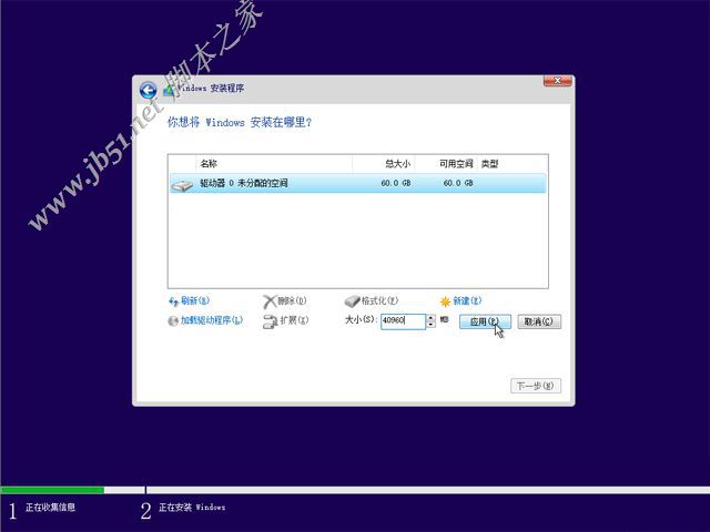 9、輸入要建立的分區(qū)大小,如果固態(tài)硬盤容量小,大小直接默認,點擊應用,建立一個分區(qū),如果要2個以上分區(qū),就自行設置大小,win10至少50G以上C盤空間,1G=1024MB,點擊應用;