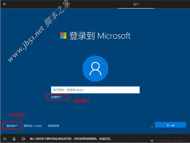 17、到創(chuàng)建帳戶界面,【創(chuàng)建帳戶】是建立微軟Microsoft帳戶,【脫機帳戶】是建立本地帳戶,這邊選擇建立脫機帳戶;