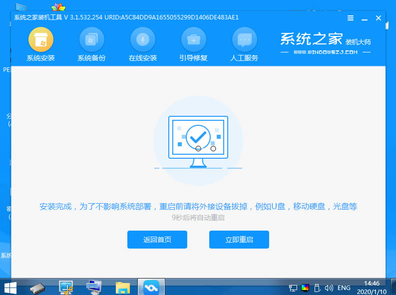 9.等待系統成功安裝后,它提示安裝已完成,取出U盤并重新啟動計算機。