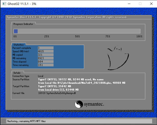 7、系統備份還原完成后,會開始系統自動安裝,安裝完成自動重啟后即可進入系統。