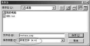 保存此文件,在打開(kāi)的“另存為”對(duì)話框中選擇好保存路徑,再單擊“保存類型”中的下拉箭頭選擇“所有文件”(一定要選擇此步,不然保存后的文件會(huì)自動(dòng)加上TXT的擴(kuò)展名),然后在“文件名”中輸入“restore.reg”后按“保存”按鈕(如圖1)。以后你就可以通過(guò)雙擊這個(gè)restore.reg來(lái)直接解除禁用注冊(cè)表的限制。