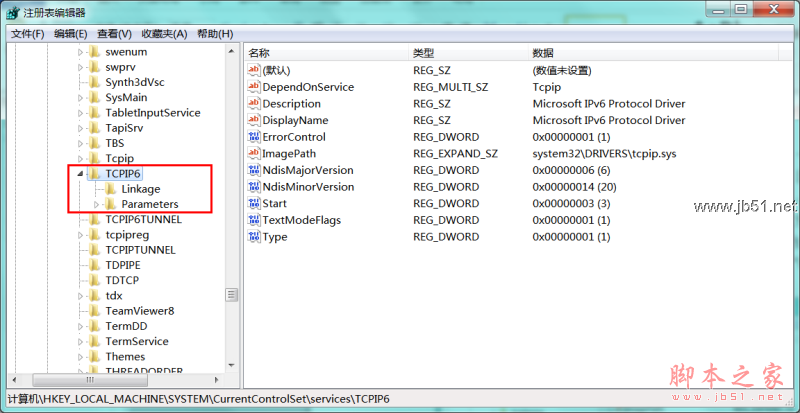 左側展開的層次結構就是鍵路徑,可以理解為目錄,一個鍵就是分支中的一個目錄,而子鍵就是這個目錄中的子目錄。子鍵同樣是一個鍵,因為子目錄下還可以有子目錄。下圖中的“TCPIP6”和“Linkage”就是鍵(子鍵)。
