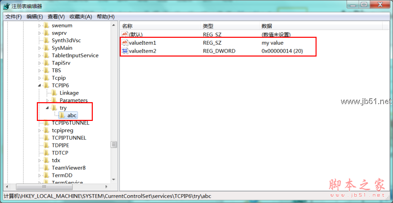 REG支持遞歸創建新的鍵(子鍵),只要在RegistryPath中加入想創建的鍵(子鍵)即可。例如使用如下語句在TCPIP6下創建子鍵try,并在try下創建子鍵abc。