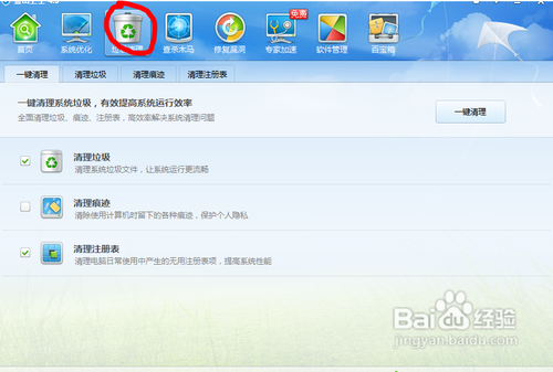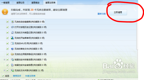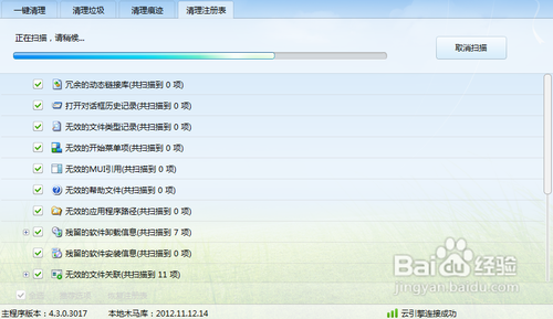 2、在“垃圾清理”頁面,選擇“清理注冊表”,即可看到清理注冊表的頁面,如下圖所示: