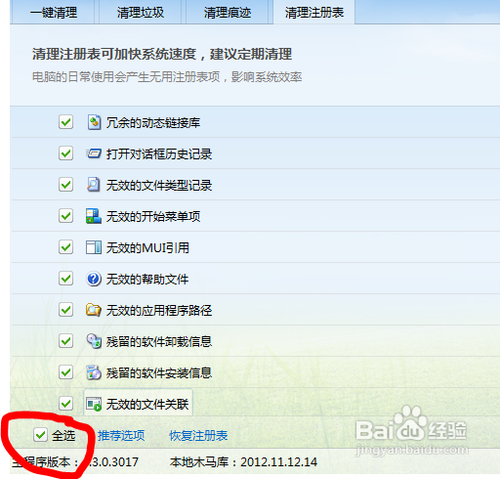 4、如果你對電腦不是很精通,害怕清理注冊表導致機器癱瘓,可以選擇“推薦選項”,如下圖所示: