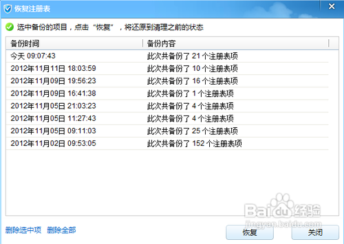 7、如果不小心清理錯了,可以點擊“恢復注冊表”,然后選擇你想要恢復的即可,如下圖所示: