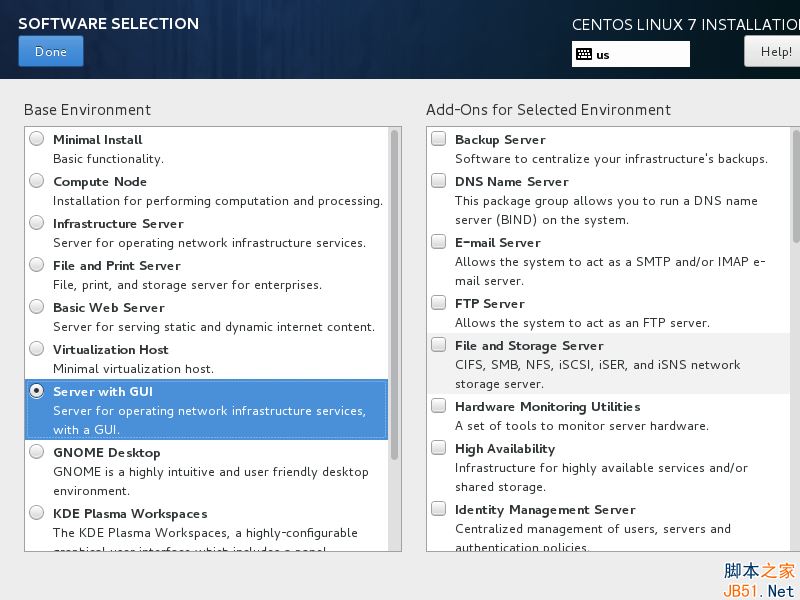8、 假設你要在服務器上安裝一個圖形界面,選擇左邊那欄“帶 GUI 的服務器Server with GUI”那項,并在右邊那欄中根據你需要提供給客戶端的服務選擇合適的附加軟件。