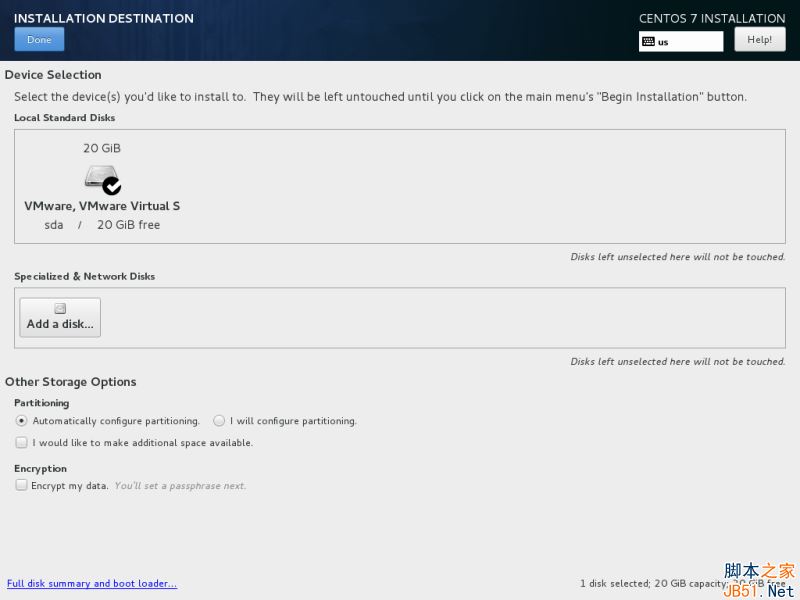 在“設備選擇Device selection”頁面,確保你已經選擇了本地磁盤。同樣,在“其他存儲選項Other Storage Options”中確保選擇了“自動配置分區Automatically configure partitioning”。