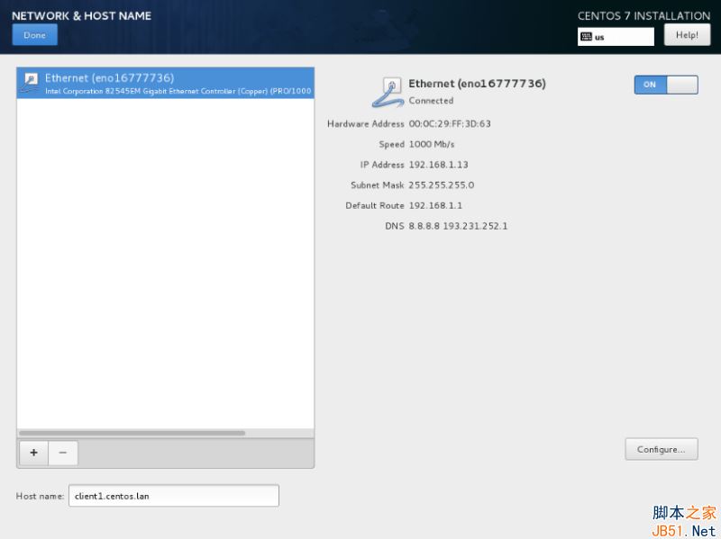 11、 在下一步中設置你的主機名并啟用網絡服務。點擊“網絡和主機名Network & Hostname”,在主機名中輸入你的 FQDN(完整限定網域名稱),如果你在局域網中有一個 DHCP 服務器,將以太網按鈕從 OFF 切換到 ON 來激活網絡接口。