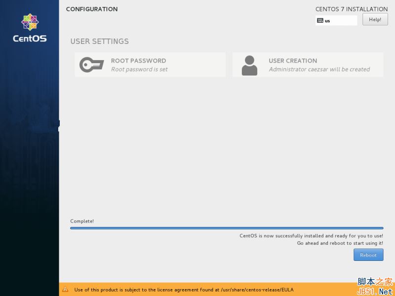16、 幾分鐘后安裝程序會報告 CentOS 已經成功安裝在你機器中。要使用系統,你只需要移除安裝媒介并重啟機器。