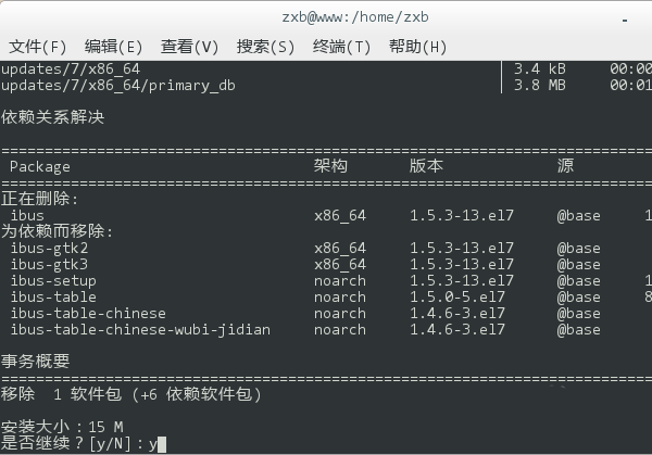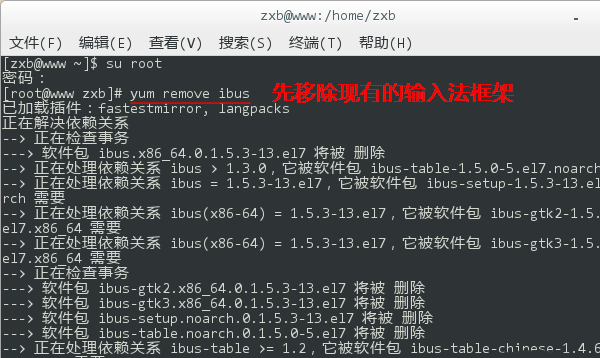 3、登錄 root 后,再鍵入 yum remove ibus,移除現(xiàn)有的輸入法框架。