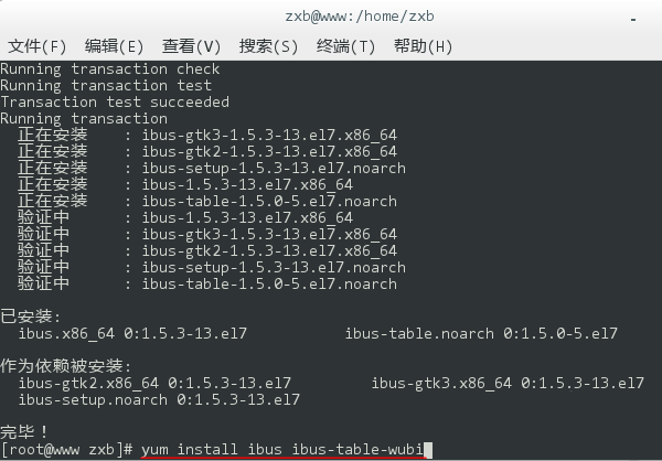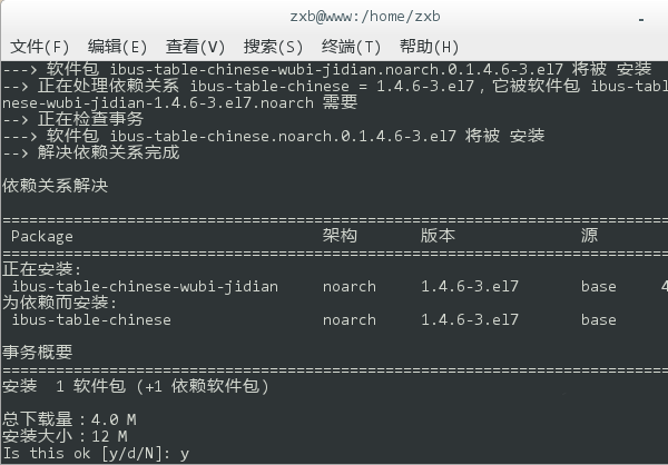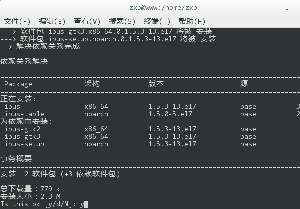 5、移除完畢后,再鍵入 yum install ibus ibus-table,回車后重新安裝輸入法框架。同樣,在執(zhí)行過程中會詢問是否確認安裝,鍵入 y 回車繼續(xù)。