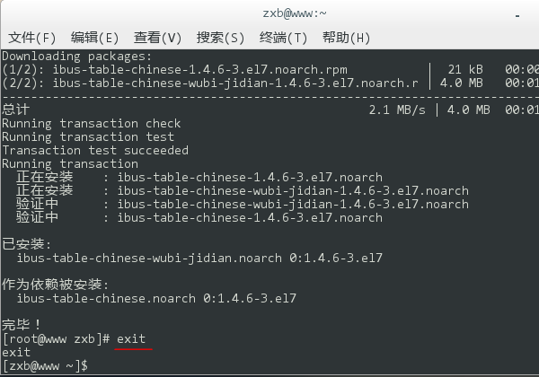 7、安裝成功后,鍵入 exit 退出 root 帳號,然后再關(guān)閉終端窗口。當然,你也可以不退出直接關(guān)閉終端(這會在關(guān)閉時彈出一個警告提示框,直接無視即可),這是沒有關(guān)系的。